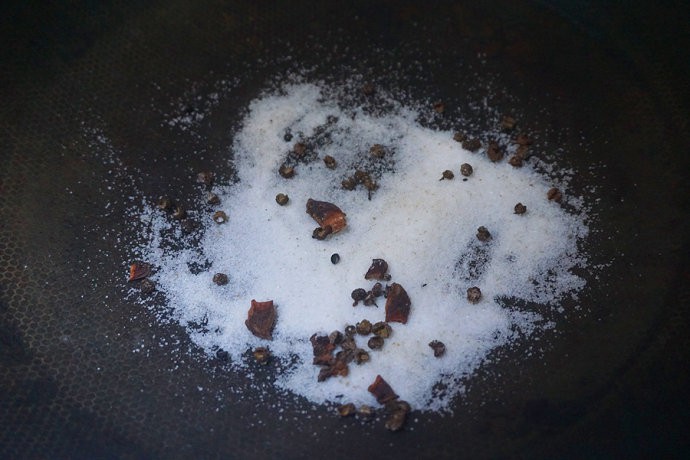 Bắc chảo khô lên bếp cùng với hạt tiêu, muối, hoa hồi rồi rang đều trên chảo cho đến khi muối chuyển sang màu vàng thì tắt .