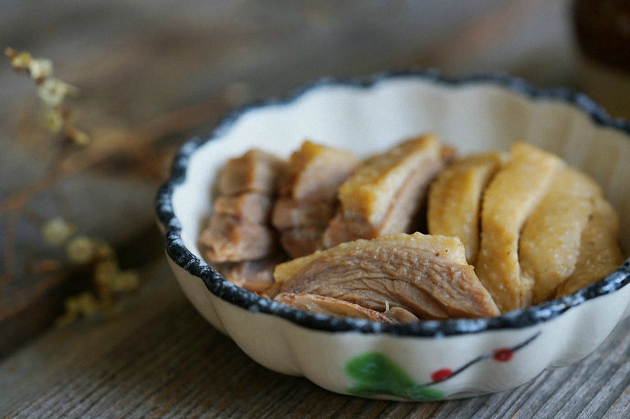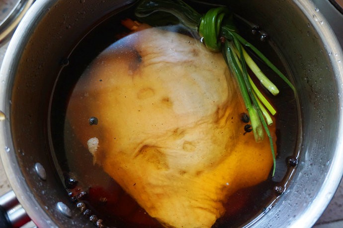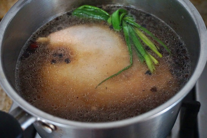 Cho muối còn dư, gừng và hành lá vào nồi cùng với rượu gạo và một lượng nước vừa phải để luộc vịt và khuấy đều. Tiếp đến cho vịt vào nấu ở lửa nhỏ.