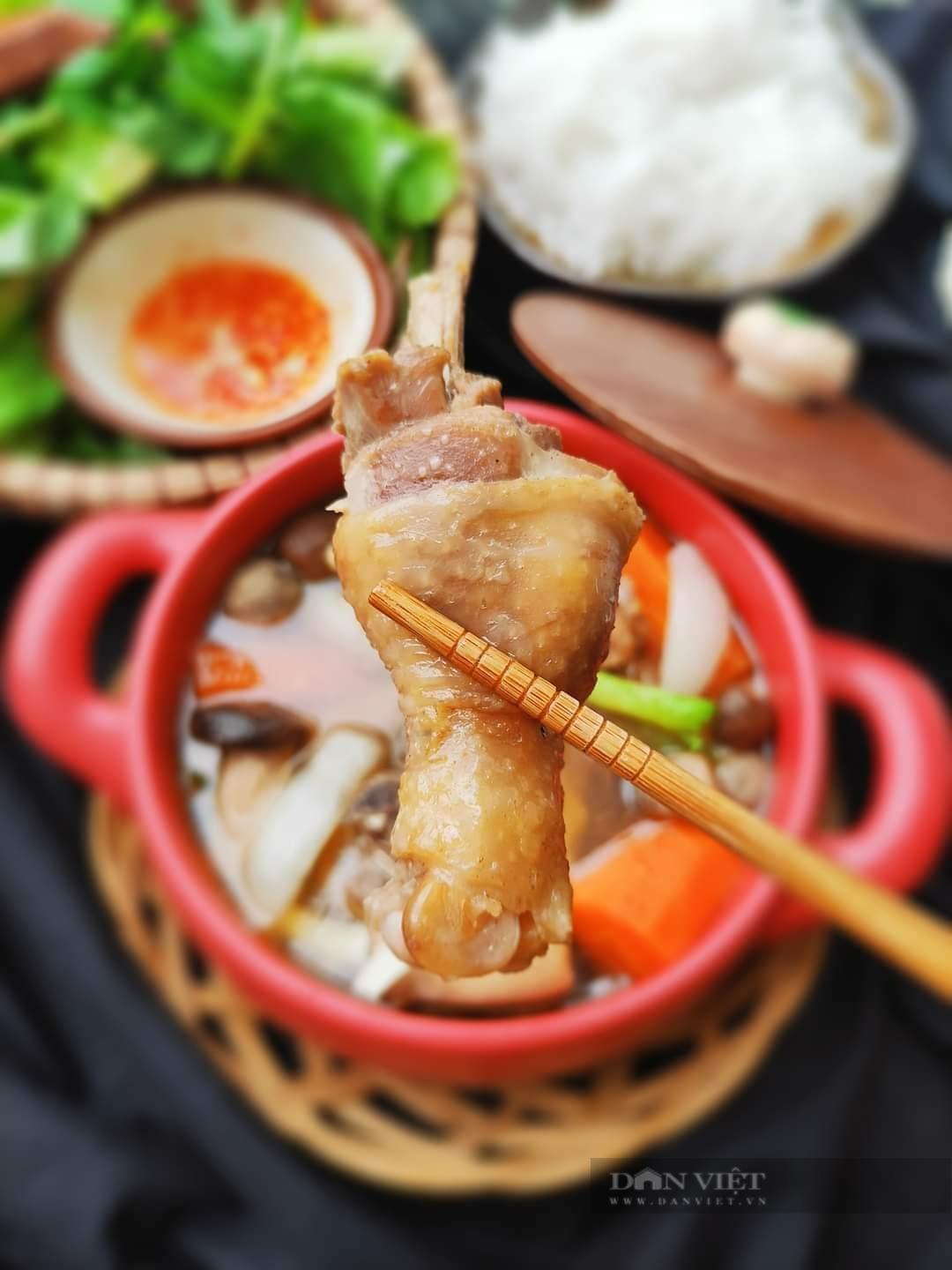 - Gà sôi thì vớt bọt đen bỏ đi và hầm với lửa nhỏ canh gà gần chín thì cho cà rốt cắt khúc vào. Khi cà rốt gần chín, cho nấm vào nấu sôi lên là được.