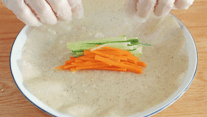 Bước 3: Cà rốt và dưa chuột gọt bỏ vỏ và cắt sợi. Bạn cũng có thể thay thế cà rốt và dưa chuột bằng những loại rau mà mình yêu thích như: ớt chuông, cải bó xôi... Hãy kết hợp các nguyên liệu trong món ăn phù hợp với nhu cầu và sở thích của gia đình bạn để tạo cảm giác ngon miệng. Sau đó, bạn đặt nồi nước lên bếp, đun sôi rồi thả cà rốt vào chần trong khoảng 30 giây, vớt ra và để riêng.