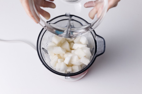 Bước 1: Lê gọt vỏ, loại bỏ hạt rồi thái khối nhỏ. Cho lê vào máy xay rồi thêm 80g nước lọc vào xay nhuyễn. Sau đó lọc lấy nước cốt lê.
