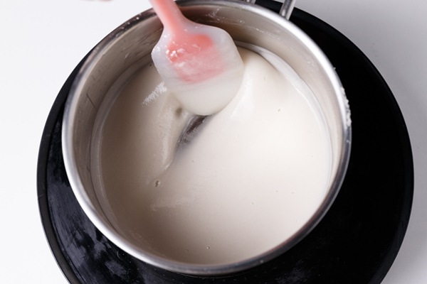 Bước 3: Đổ 40g bột bắp vào rồi khuấy đều liên tục, khuấy ở lửa vừa cho đến khi bột đặc lại (khuấy liên tục để tránh bị dính đáy nồi).