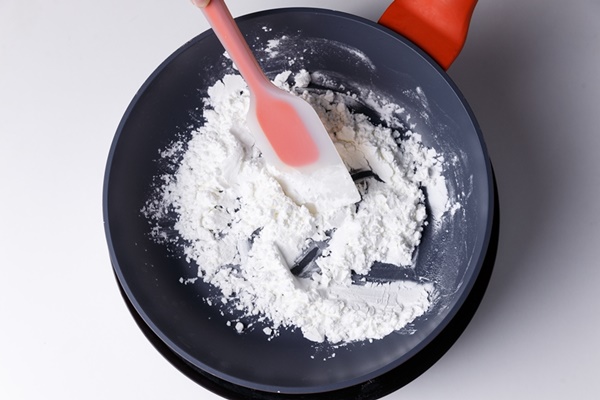 Bước 5: Đổ 20g bột bắp vào chảo rang cho bột chín vàng rồi để nguội.