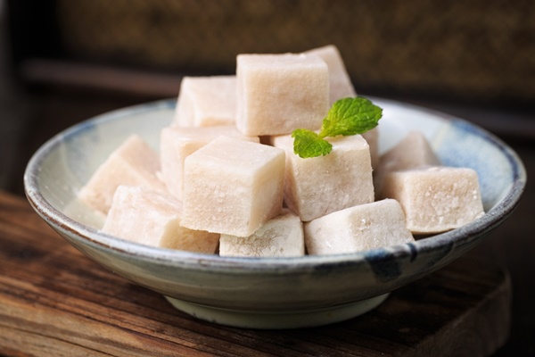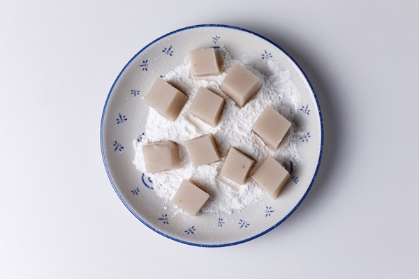 Bước 6: Lấy bánh ra khỏi khuôn, cắt bánh thành khối vừa ăn sau đó lăn bánh qua bột bắp đã rang chín sao cho bột phủ đều miếng bánh là được.