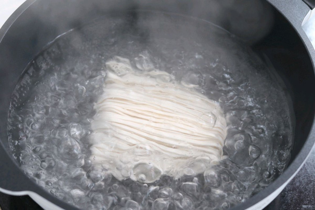 Sau đó đun sôi một nồi nước rồi cho mì vào luộc. Khi mì vừa chín thì đổ ra rổ và xả dưới vòi nước lạnh. Bạn xả nước cho tới khi mì không còn nóng nữa, vừa xả vừa xóc đều lên. Công đoạn này giúp mì tơi và sợi mì không bị nát.