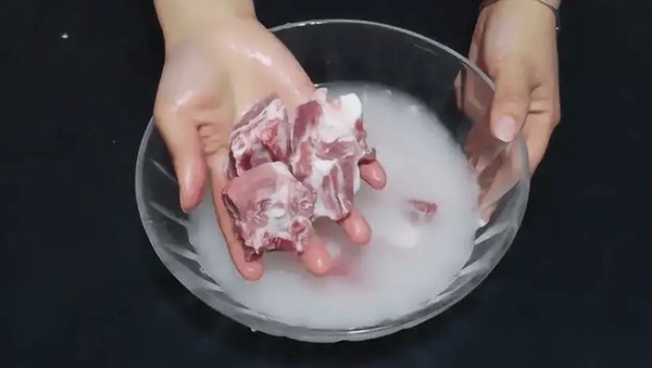 Bước 1: Sườn heo mua về rửa sạch, chặt thành miếng nhỏ vừa ăn. Sau đó bạn cho sườn vào tô nước cùng với 1 thìa muối ngâm trong khoảng 45-60 phút. Nước muối có thể loại bỏ hết phần huyết thừa, tạp chất bám trong sườn, đồng thời có thể khử trùng và làm giảm mùi tanh, khiến món ăn sau khi nấu có vị ngon hơn. Sau khi bạn thấy sườn chuyển sang màu trắng, bạn đổ nước đi, thêm 2 thìa bột mì vào rồi bóp cùng sườn. Sau đó rửa sạch lại với nước, để ráo.