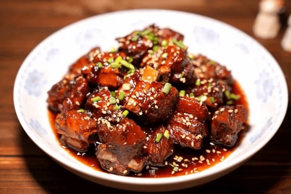 500g sườn heo tươi, hành lá, gừng, tép tỏi, hoa hồi, lá nguyệt quế, quế, rượu nấu ăn, nước tương, 3 thìa canh giấm balsamic, đường, sốt cà chua, muối và dầu ăn.