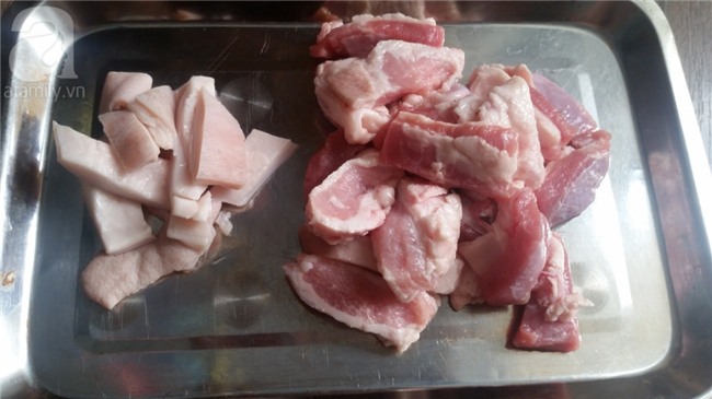 Thịt lợn rửa sạch, thái miếng vừa ăn. Bì lợn làm sạch cắt miếng nhỏ.