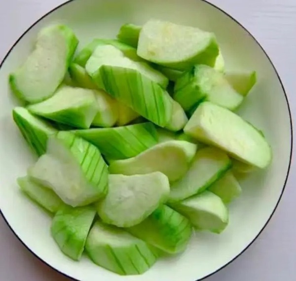 Bước 1: Mướp hương bạn mua về đem gọt bỏ vỏ. Sau đó bạn đem mướp rửa sạch rồi cắt miếng vừa ăn. Hành lá bạn cắt bỏ gốc, nhặt lá héo rồi xắt nhỏ.