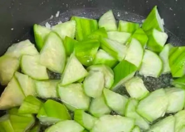Bước 2: Đặt nồi lên bếp, cho dầu ăn vào đun nóng. Sau đó thêm tỏi băm vào, phi cho đến khi dậy mùi thơm. Sau đó bạn cho mướp vào, xào đều.
