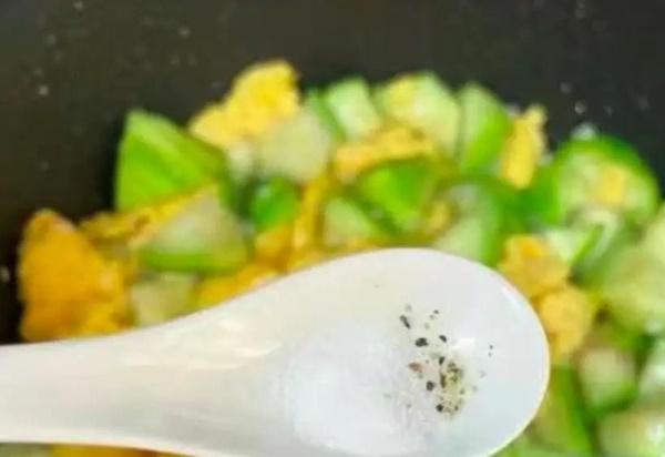 Bước 3: Sau khi mướp chuyển màu thì bạn cho trứng vào, đảo nhẹ, đều tay. Tiếp theo bạn nêm chút muối và bột cốt gà (hoặc bột nêm) cho vừa khẩu vị. Xào đến khi các nguyên liệu chín thì tắt bếp, cho ra đĩa.