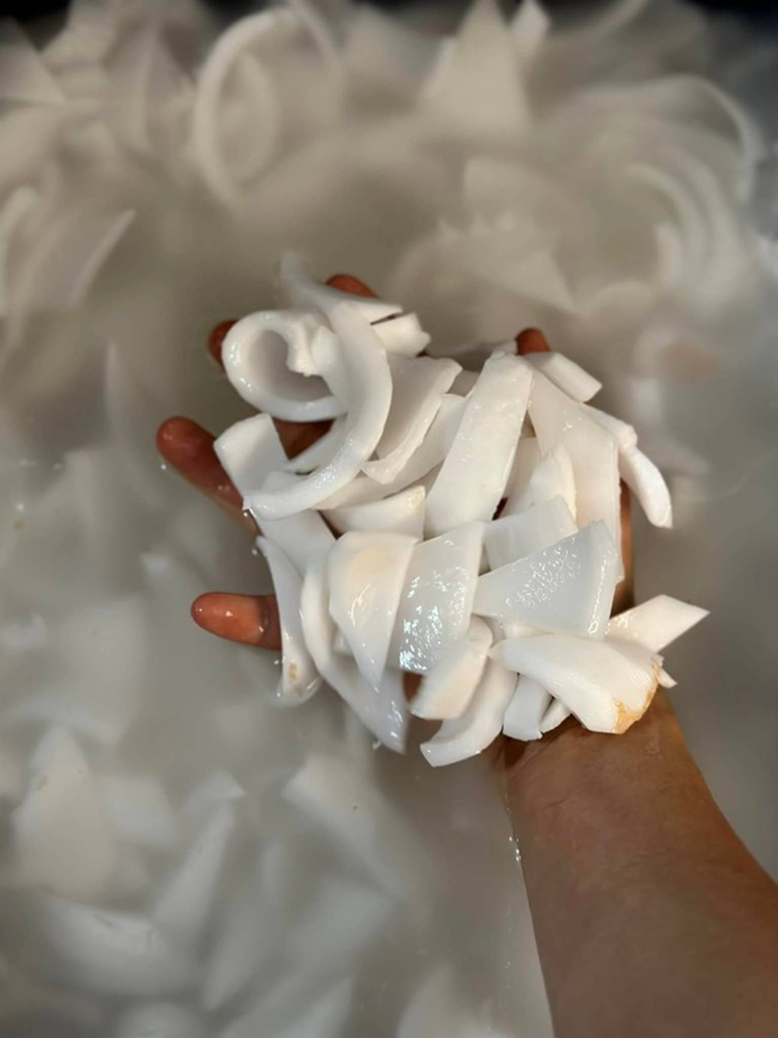 - Khi sên thấy miếng dừa bị gấp khúc nhớ lật ra, vì chỗ gấp đó hay bị ướt, để lâu sẽ ướt sang các miếng khác và làm mứt nhanh hỏng.
