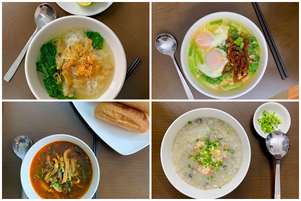 Phở gà/ Cháo bí đỏ/ Mỳ vịt tiềm/ Bánh mỳ + Xíu mại trứng muối