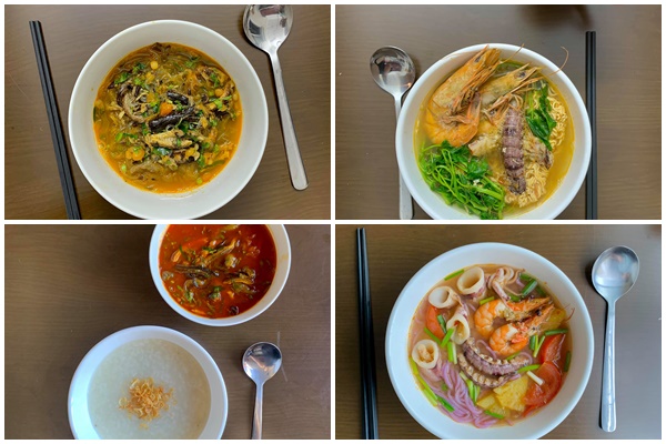 Phở bò/ Bún sườn chua/ Mỳ tôm trần thịt heo/ Mỳ tôm thập cẩm
