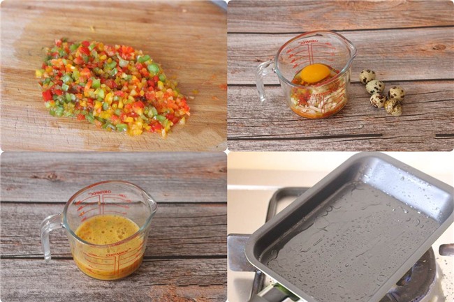 Ớt chuông các loại thái nhỏ. Đập trứng gà và trứng cút vào cốc, thêm ớt chuông và chút muối vào đánh tan. Quét một lớp dầu ăn vào chảo chống dính rồi đun nóng.