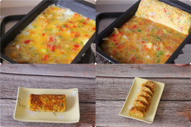 Đổ trứng đã đánh tan vào chảo chiên cho một mặt se lại rồi cuộn trứng lại chiên cho đến khi trứng chín là được. Lấy trứng ra đĩa cắt miếng vừa ăn là xong.