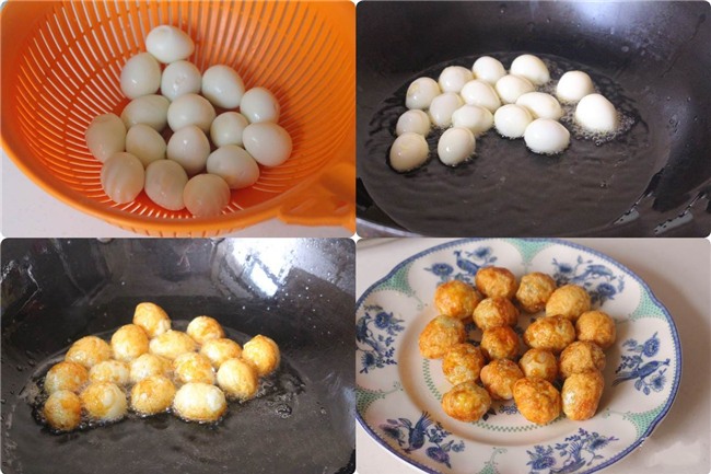 Trứng cút luộc chín bóc bỏ vỏ. Đun nóng dầu ăn trong chảo, cho trứng cút vào chiên đến chín vàng đều thì vớt ra đĩa.