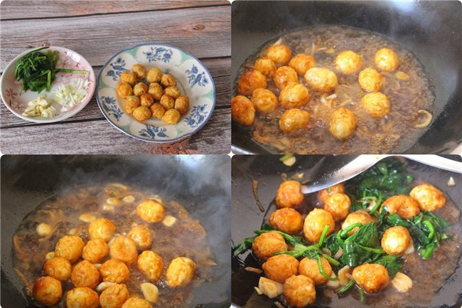 Tỏi và gốc hành thái nhỏ, rau bina rửa sạch rồi luộc qua sau đó vớt ra cho ráo nước. Đun nóng một ít dầu ăn trong chảo, cho gốc hành, tỏi vào xào thơm rồi đổ trứng cút vào đảo qua, nêm thêm muối và nước tương vào cùng với một ít nước lọc. Bạn rim cho trứng thấm gia vị. Cuối cùng đổ rau bina vào đảo đều là xong.