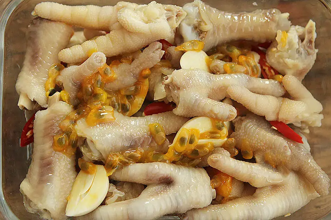 Để gà ráo nước, cho vào hộp thủy tinh. Cho tỏi và chanh cắt lát vào, rắc ớt lên trên. Tiếp đó, cho phần cùi chanh dây lên hộp chân gà.
