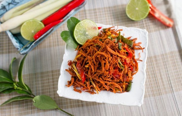Khô gà lá chanh là món ăn ngon được nhiều người yêu thích. Khi ăn có thể vắt thêm chút chanh tuỳ sở thích.