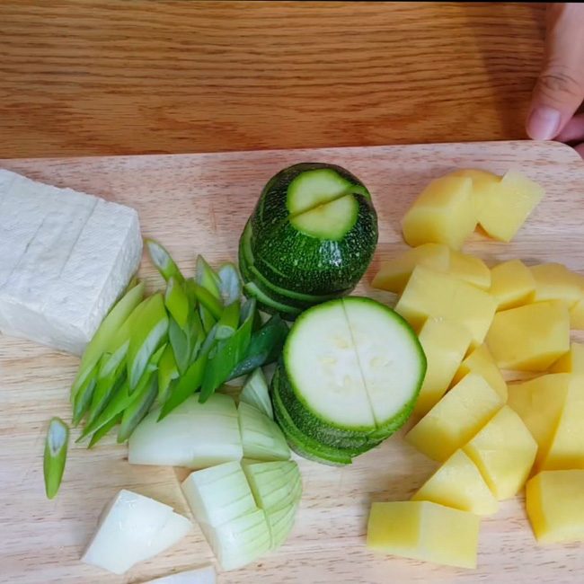 Rửa sạch các nguyên liệu, khoai tây cắt khúc vừa ăn, bí ngòi cắt lát. Hành tây và hành boa rô cắt miếng nhỏ. Đậu hũ cắt thành từng miếng nhỏ vừa ăn.