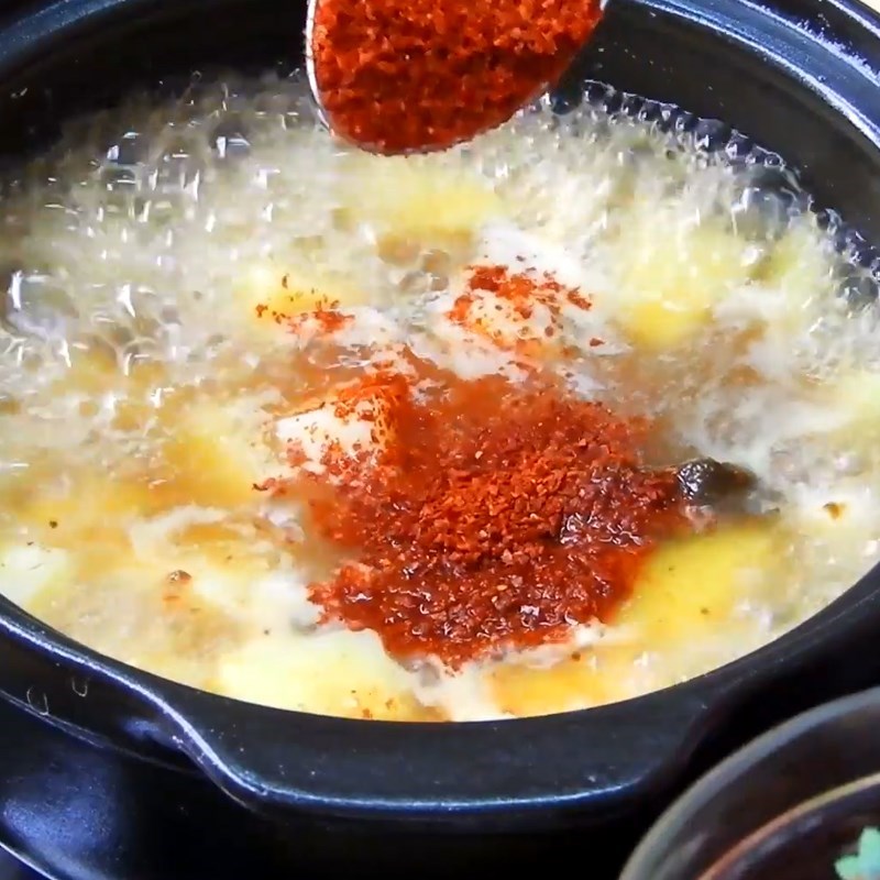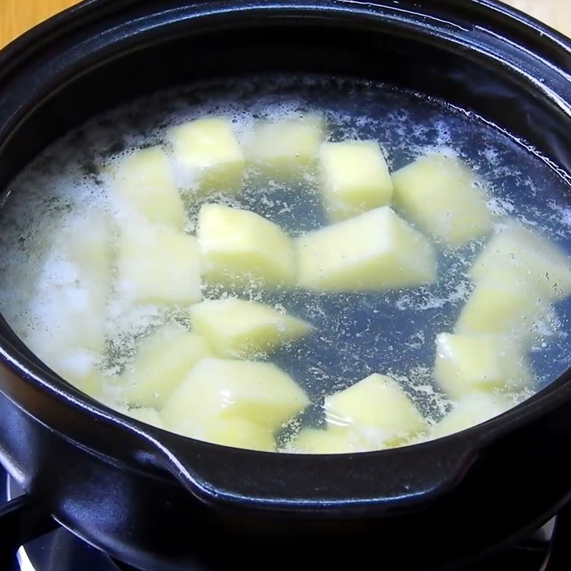 Bắc nồi lên bếp và cho vào 1 lít nước đun sôi, sau đó cho khoai tây vào nấu 10 phút rồi thêm vào 1 muỗng canh đậu tương, 1 muỗng cà phê ớt bột và khuấy đều hỗn hợp.