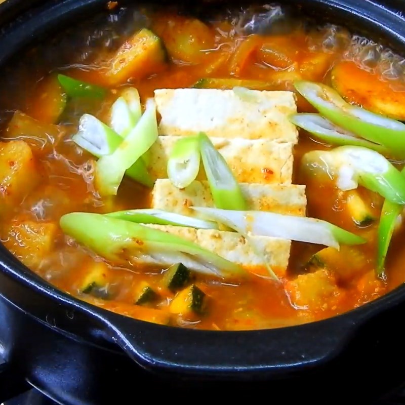 Sau khi khoai tây chín khoảng 60%, bạn cho bí ngòi và hành tây vào nấu, canh cho bí ngòi vừa chín, bạn cho đậu hũ, hành boa rô vào nấu thêm 5 phút thì tắt bếp.