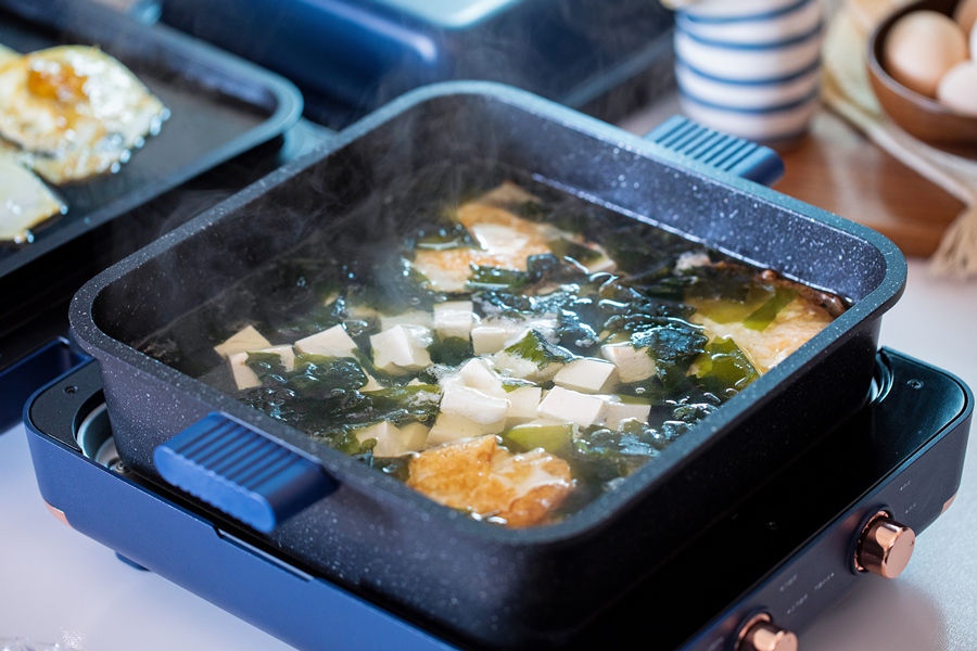 Khi nước sôi thì cho rong biển và đậu phụ vào đun sôi trở lại.
