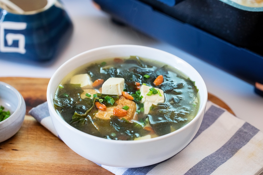 Nấu cho rong biển, đậu phụ chín thì nêm thêm chút muối cho vừa ăn. Sau đó thêm hành lá, kỷ tử vào rồi tắt bếp.
