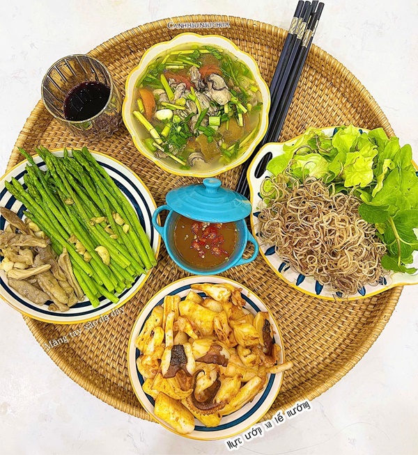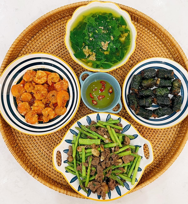 Canh cua mùng tơi; Tôm rim; Chả lá lốt; Măng tây xào thịt bò.
