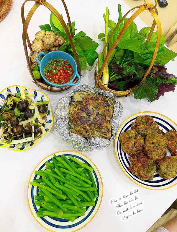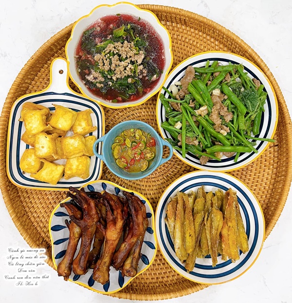 Canh rau dền nấu thịt; Ngọn bí mix đỗ xào thịt bò; Cá bống chiên giòn; Chân gà nướng; Đậu chiên.