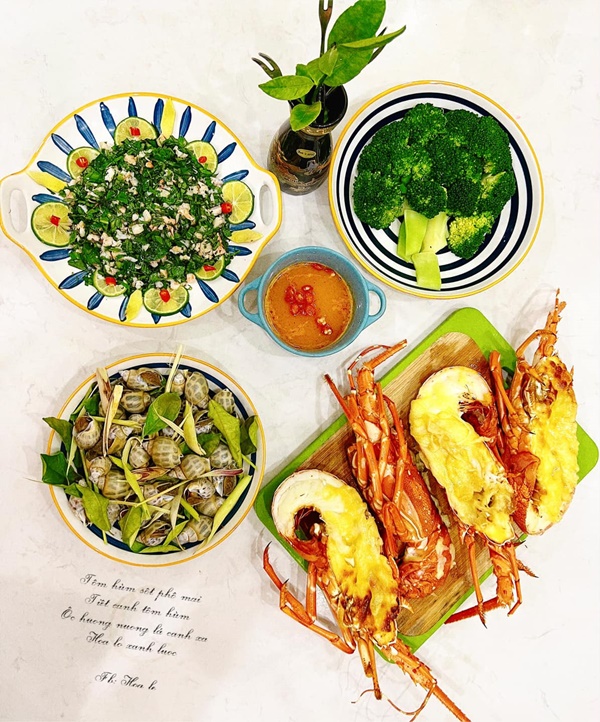 Tiết canh tôm hùm; Tôm hùm nướng phô mai; Ốc hương nướng xả chanh; Súp lơ xanh luộc.