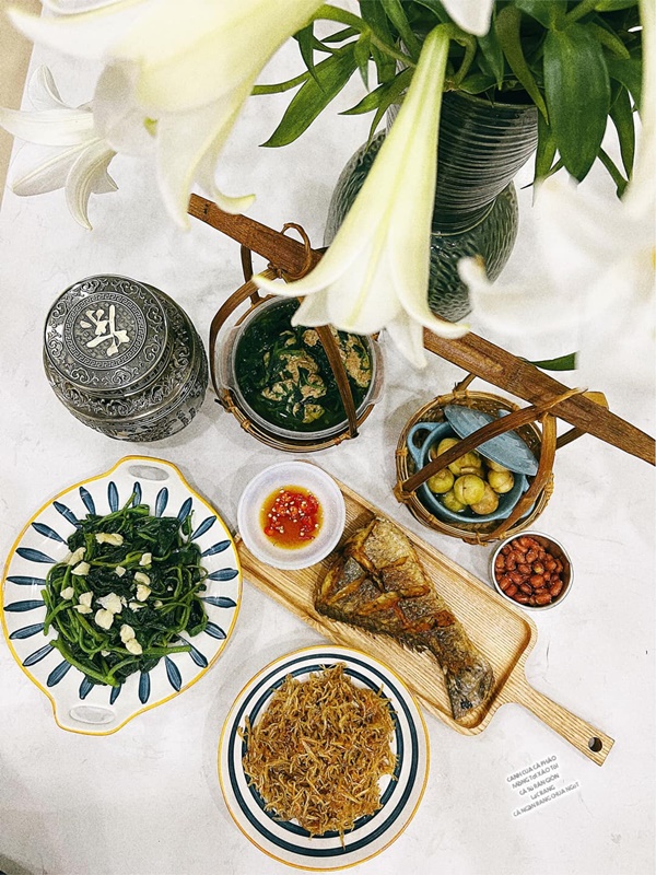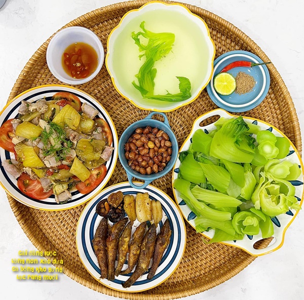 Canh cua cà pháo; Cá ngần rang chua ngọt; Cá sủ rán giòn; Mồng tơi xào tỏi; Lạc rang.