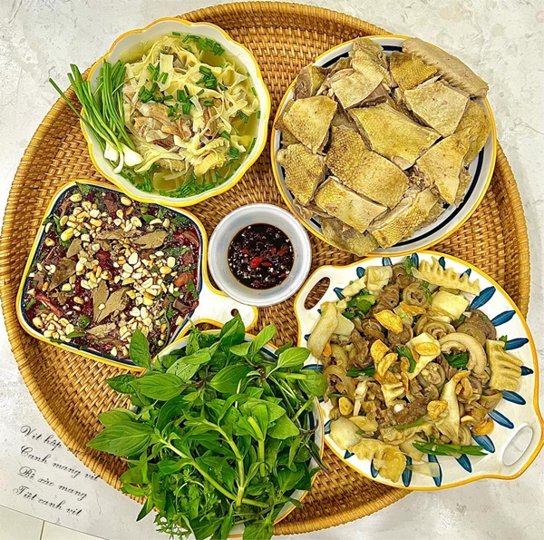 Vịt hấp nước dừa; Tiết canh vịt' Canh vịt nấu măng; Măng xào bê.