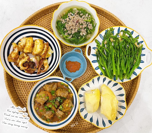 Ngồng cải xào tỏi; Cải cúc nấu thịt; Sườn xốt chua ngọt; Mực chiên bơ; Sầu riêng.