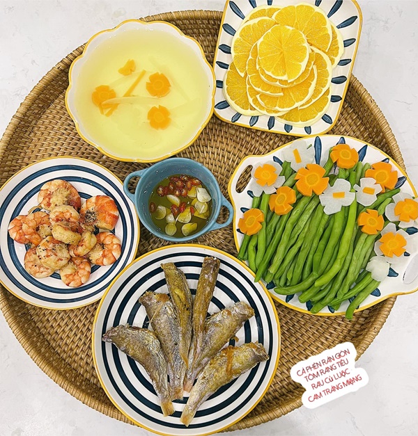 Rau củ mix luộc; Cá phèn rán giòn; Tôm rim tiêu; Cam tráng miệng.