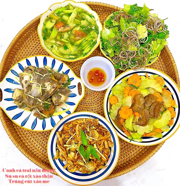 Canh cá trai nấu mùng; Thận xào su su cà rốt; Trúng cút xào me.