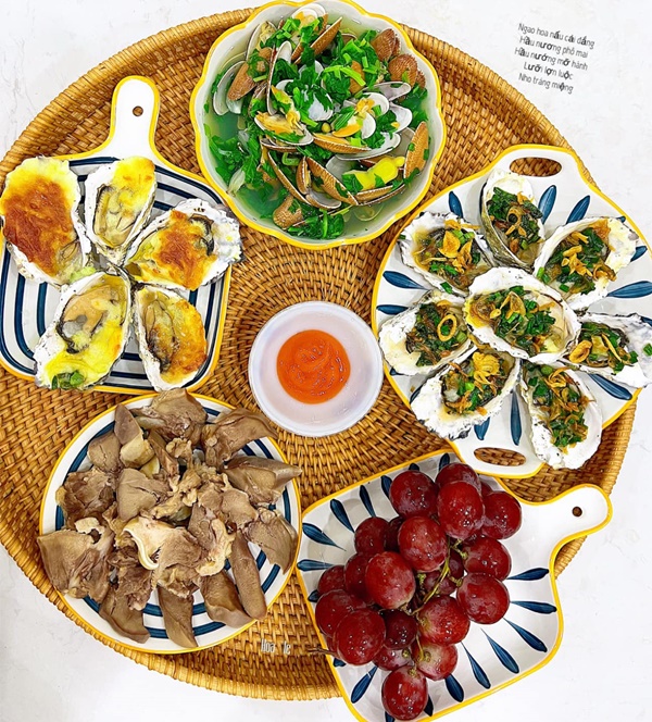 Hầu nướng phô mai; Hầu nướng mỡ hành; Canh cải nấu ngao hoa; Nho.