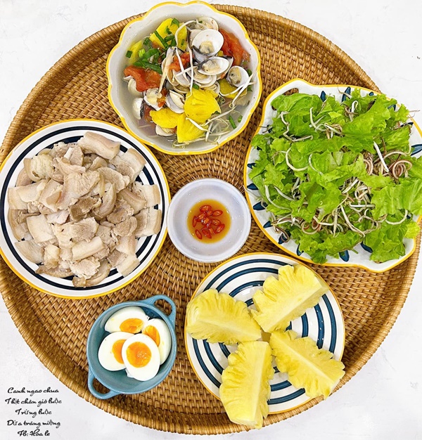 Canh ngao chua; Thịt chân giò; Trứng luộc; Dứa.