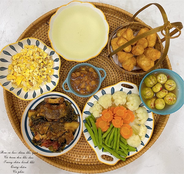 Rau củ chấm kho quẹt; Trứng chiên hành; Cá trắm đen kho dưa; Cà pháo; Bánh quẩy chiên.