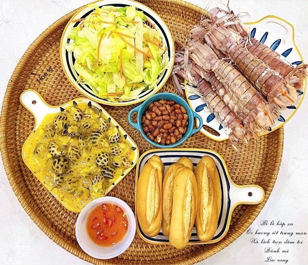Rau xà lách trộn; Lạc rang; Bề bề hấp xả; Bánh mì ăn kèm ốc hương sốt phô mai.