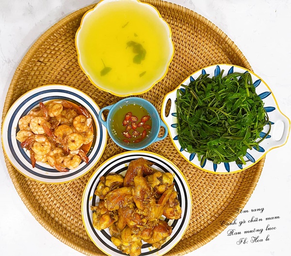 Tôm rang tiêu; Cánh gà chiên mắm; Rau muống luộc.