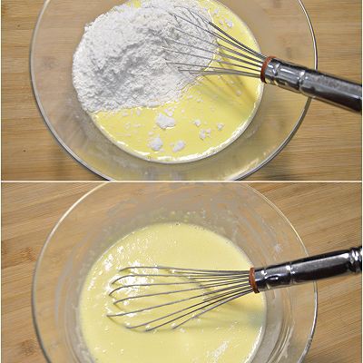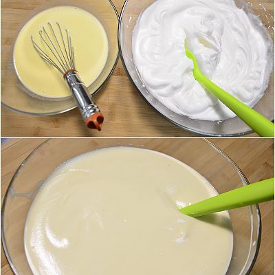 Chia lòng trắng thành 3 phần, cho 1 phần vào phần lòng đỏ trộn đều cho phần lò đỏ loãng ra. Sau đó đổ phần lòng đỏ này vào âu còn 2/3 lòng trắng. Dùng phới dẹt trộn nhẹ nhàng và dứt khoát.