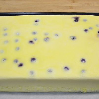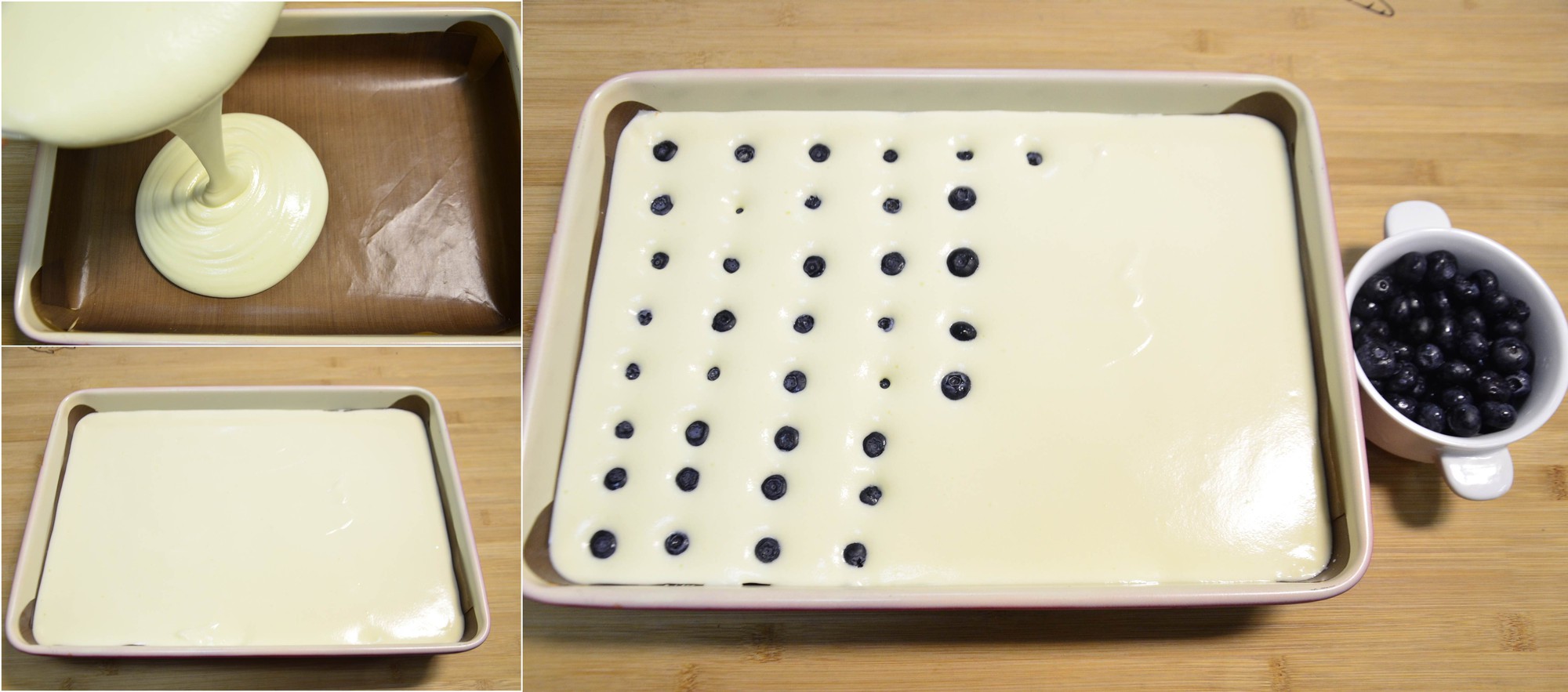 Đổ hỗn hợp bột vào khuôn có lót giấy nướng, nhẹ nhàng xếp việt quất vào khắp khuôn bánh.