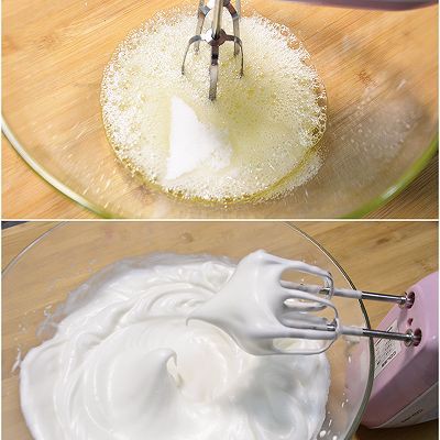 Cho lòng trắng trứng vào bát cùng với đường và vài giọt nước cốt chanh. Dùng máy đánh trứng đánh cho bông cứng.