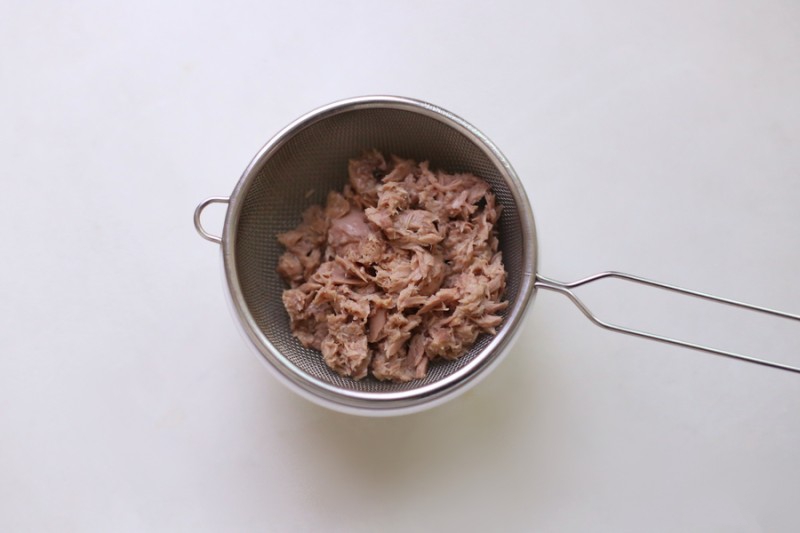 Cho thịt cá ngừ đóng hộp ra một cái rây lọc để cho ráo dầu.