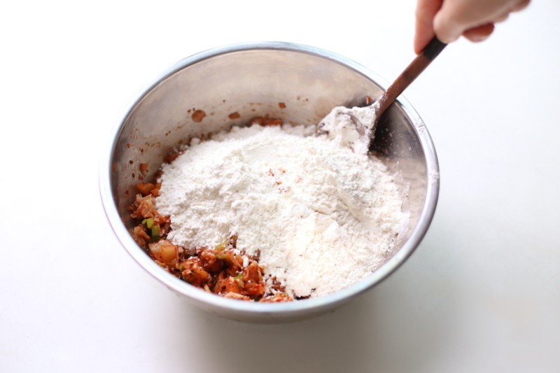 Cho kim chi vào thố, thêm thịt cá ngừ, gốc hành, ớt xanh, bột ớt và chút đường vào.