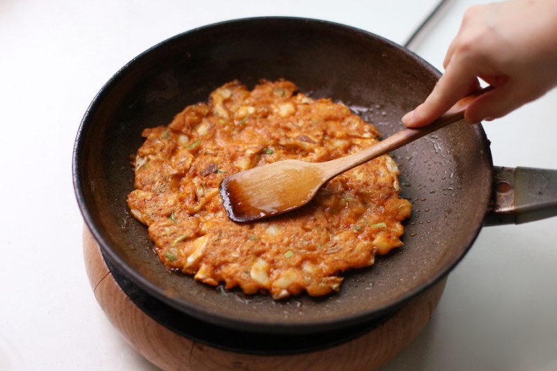 Chiên chín vàng một mặt thì lật mặt bánh, chiên chín mặt còn lại là xong.
