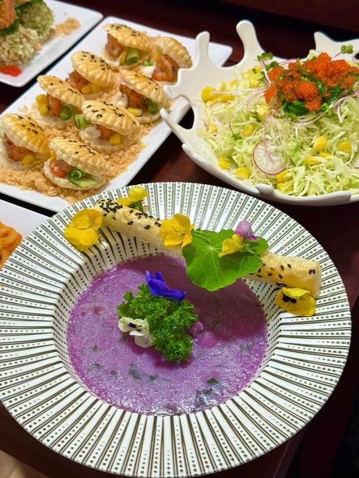 Màu tím tự nhiên của khoai môn khi chế biến vẫn được giữ nguyên. Bên cạnh đó, phần súp sánh mịn với nền kem sữa, nhìn thấy rõ rau mùi xanh tạo điểm nhấn bắt mắt. Phần trang trí cho súp là bánh phồng cuộn rắc mè đen. Phần bánh giòn, giúp cân bằng với độ sánh bèo của món súp.