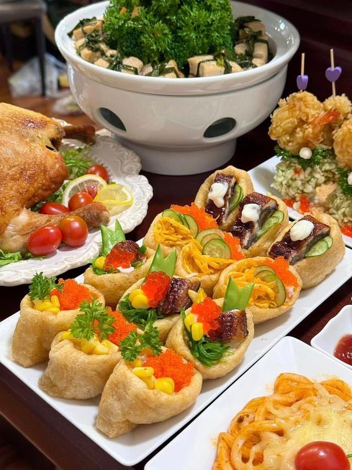 Salad bắp cải rong biển và trứng cá trích và những món ăn ngon miệng, sang trọng trên bàn tiệc. (Ảnh: NVCC)